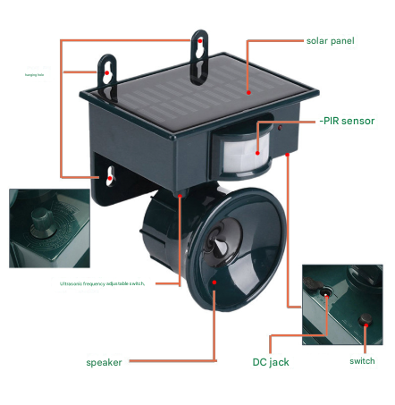 Safety & Usage Notice: This device uses rechargeable batteries. For best results, place the unit in an area that receives direct sunlight. While the ultrasonic sound is designed as a humane deterrent and is generally outside the range of human hearing, please observe your own domestic pets for any signs of discomfort and adjust placement or frequency if necessary.