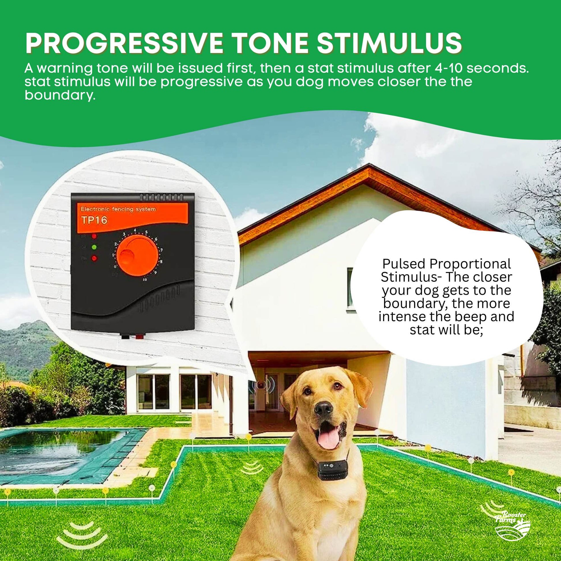 - Progressive Tone Stimulus-A warning tone will be issued first, then a stat stimulus after 4-10 seconds. stat stimulus will be progressive as you dog moves closer the the boundary.
