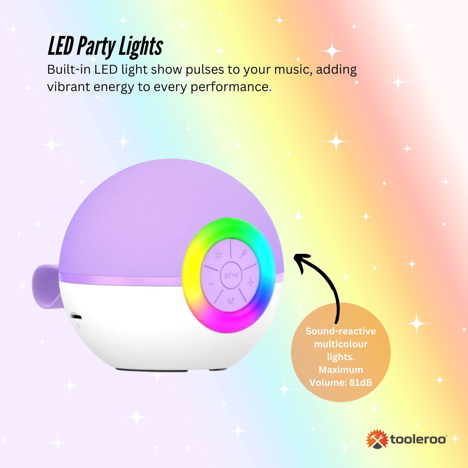 - LED Party Lights – Built-in LED light show pulses to your music, adding vibrant energy to every performance.