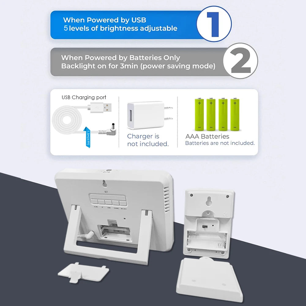 Indoor outdoor temperature humidity monitor works with the 1.5M USB cable (INCLUDED) or AAA batteries (NOT INCLUDED).